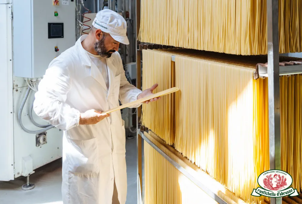• 特製青銅模與粗糙表面: 麵條通過特製青銅模時,會產生獨特的粗糙表面(rustic),這也正是品牌名稱「Rustichella」的由來。這種恰到好處的粗糙感能完美吸附醬汁,讓每一口都滋味飽滿。