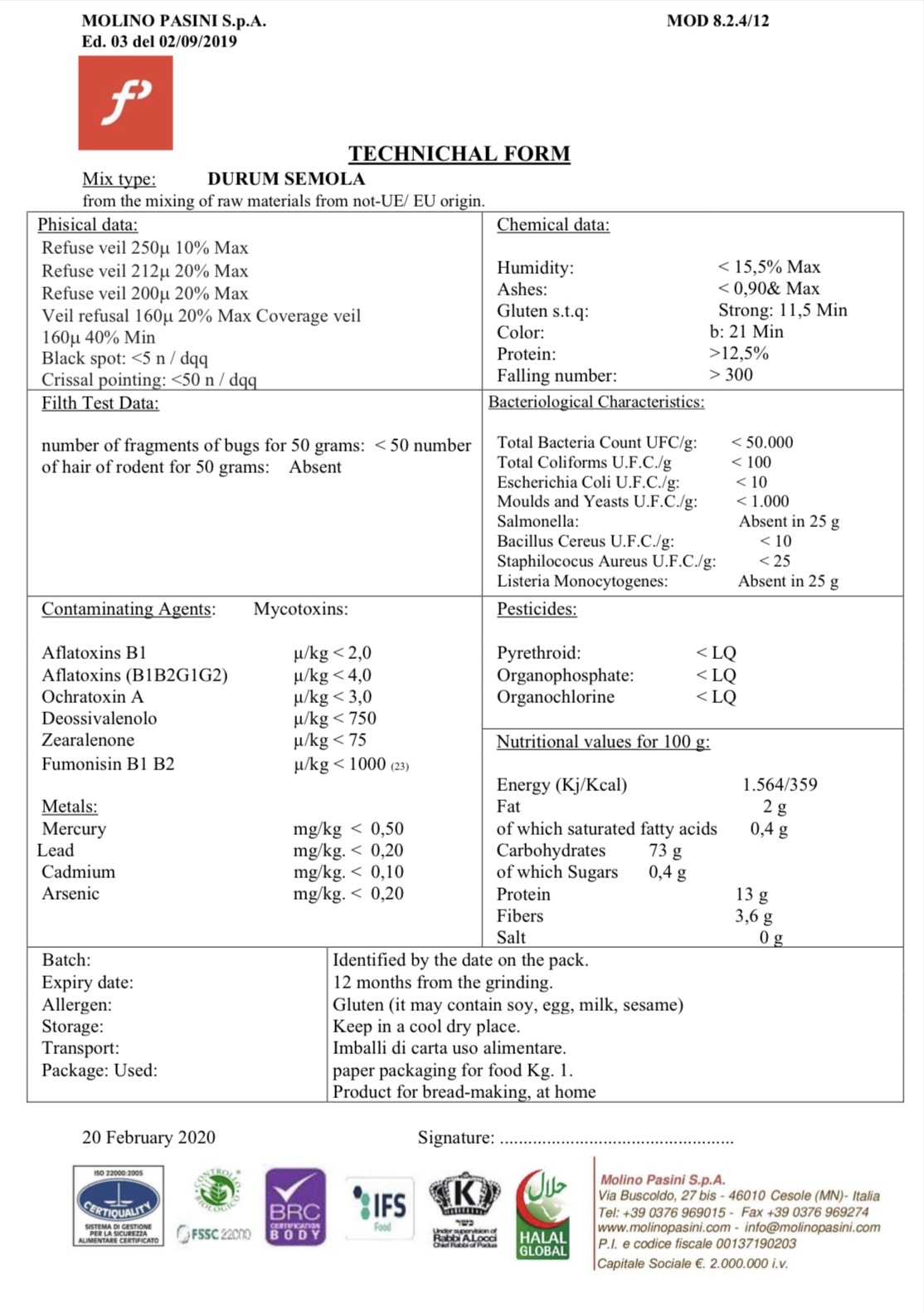 Molino Pasini 帕西尼麵粉坊歷經百年歷史,烙印在DNA的麵粉技藝!帕西尼磨坊致力於生產高品質麵粉,精選產自義大利曼圖阿地區(Mantova)的小麥,有適合烘焙業者、手工麵與披薩店等的優秀產品,精挑細選的原料,經由現代化研究室分析與研發,以達品質標準,對於細節的專注與技術的精準度,使其在義大利國內外備受讚賞。細杜蘭麥粉適合用於製作各式義式麵食,經多次研磨,更容易揉捏。